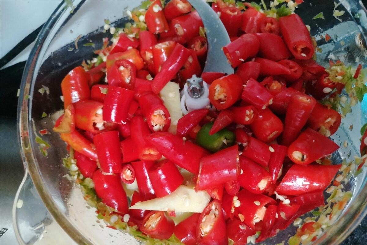 第四步,下面就可以往里面加盐了,这里要记住,盐和红辣椒的比例是多少呢?其实很好掌握,辣椒与盐的量,为10:1为宜,太少了容易发酸、变质,太多了又会导致味道太重,吃起来过咸。