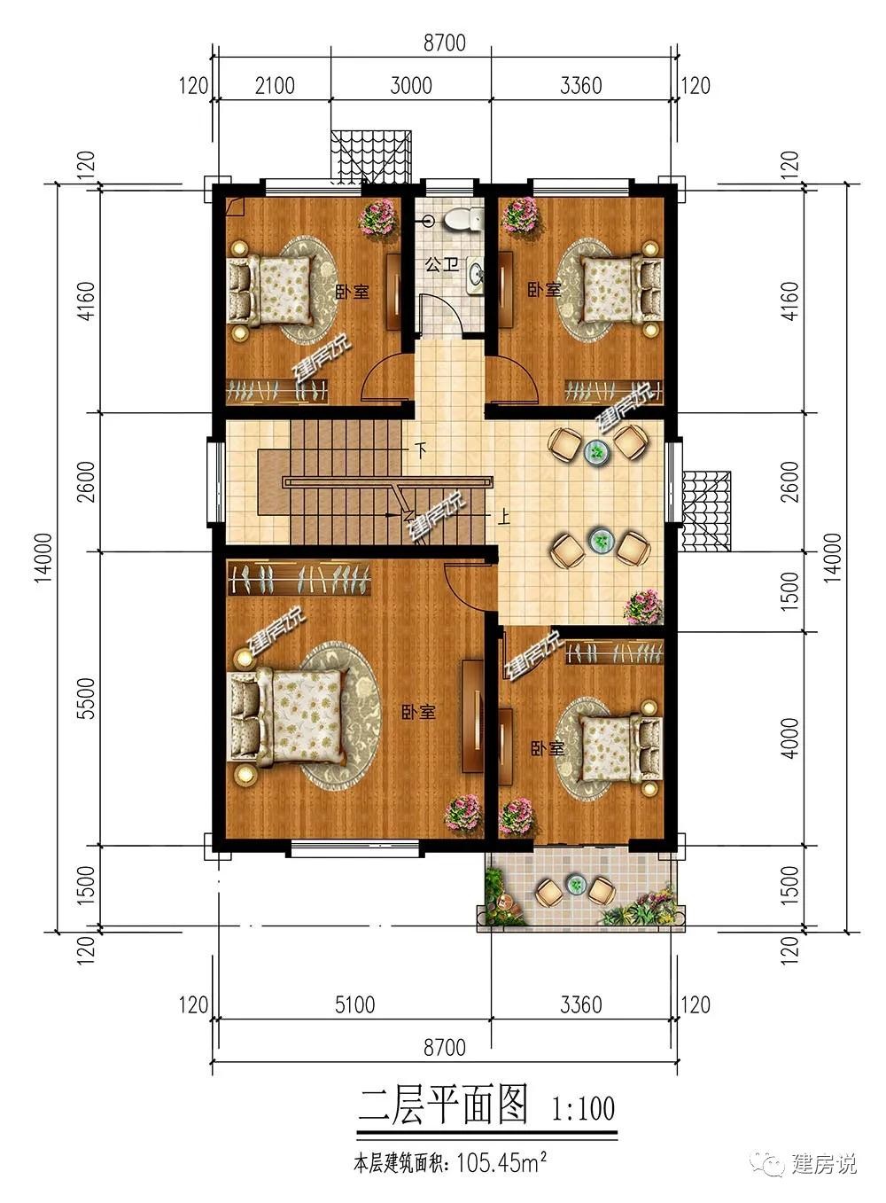 别墅图纸编号:JF9235、主体毛坯参考造价:24-30万、占地面积:105.45平方米、建筑面积:226.07平方米、开间8.7米,进深14米、框架结构,建筑高9.3米