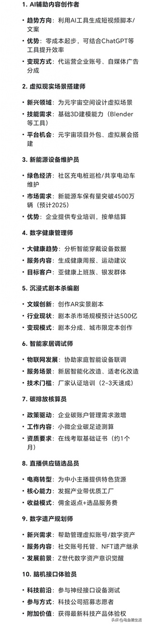 趋势方向:利用AI工具生成短视频脚本/文案优势:零成本起步,可结合ChatGPT等工具提升效率变现方式:代运营企业账号、自媒体广告分成