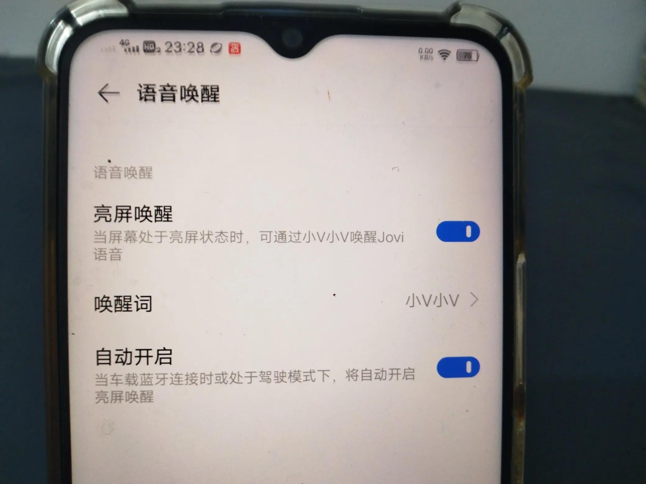 把亮屏唤醒后面的按钮打开,这样在屏幕处于亮屏状态时,就能通过“小v小v”来唤醒语音助手功能。(如上图所示)