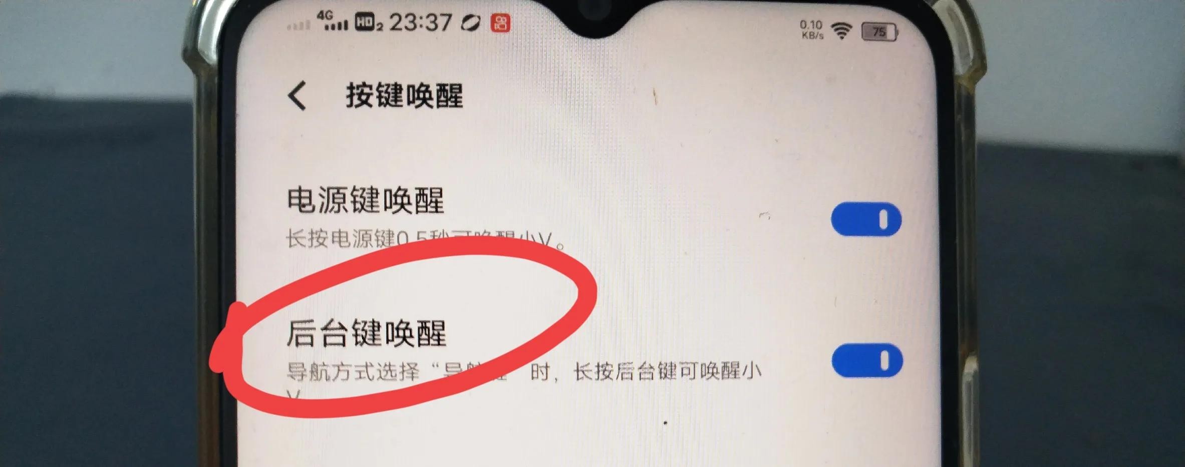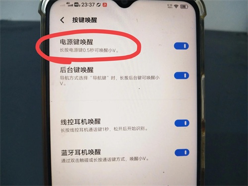 您可以通过电源键唤醒,长按电源键 0.5 秒就能唤醒小 V。这个开关一定要打开,因为部分老旧的 VIVO 手机不支持语音唤醒功能,只支持电源键唤醒。(如上图所示)