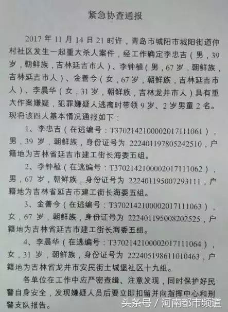 2017年11月16日,青岛城阳警方发布了一则协查通报,因与城阳重大杀人案有重大犯罪嫌疑,依法通缉李忠吉等四人。