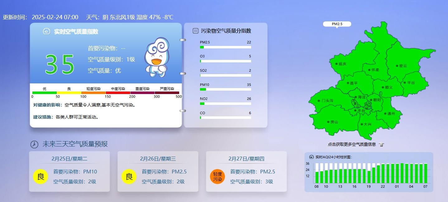 据北京市生态环境监测中心今早7时数据,目前实时空气质量指数35,空气质量优。