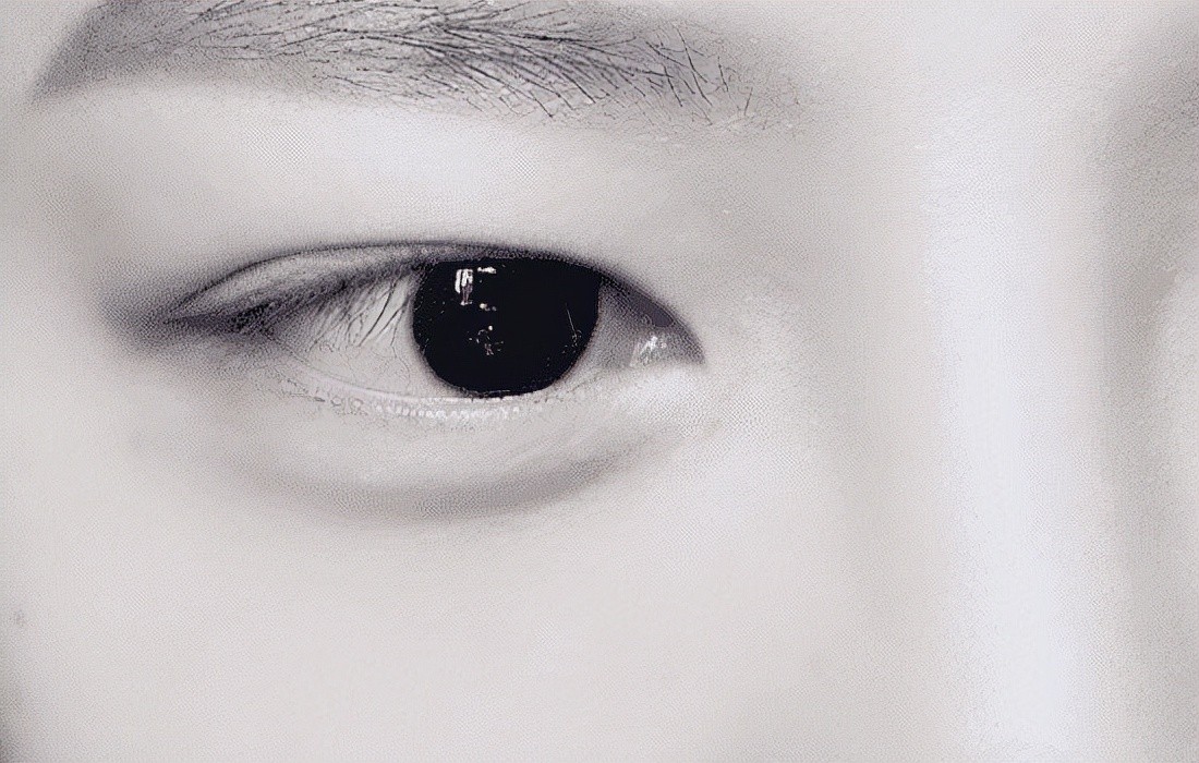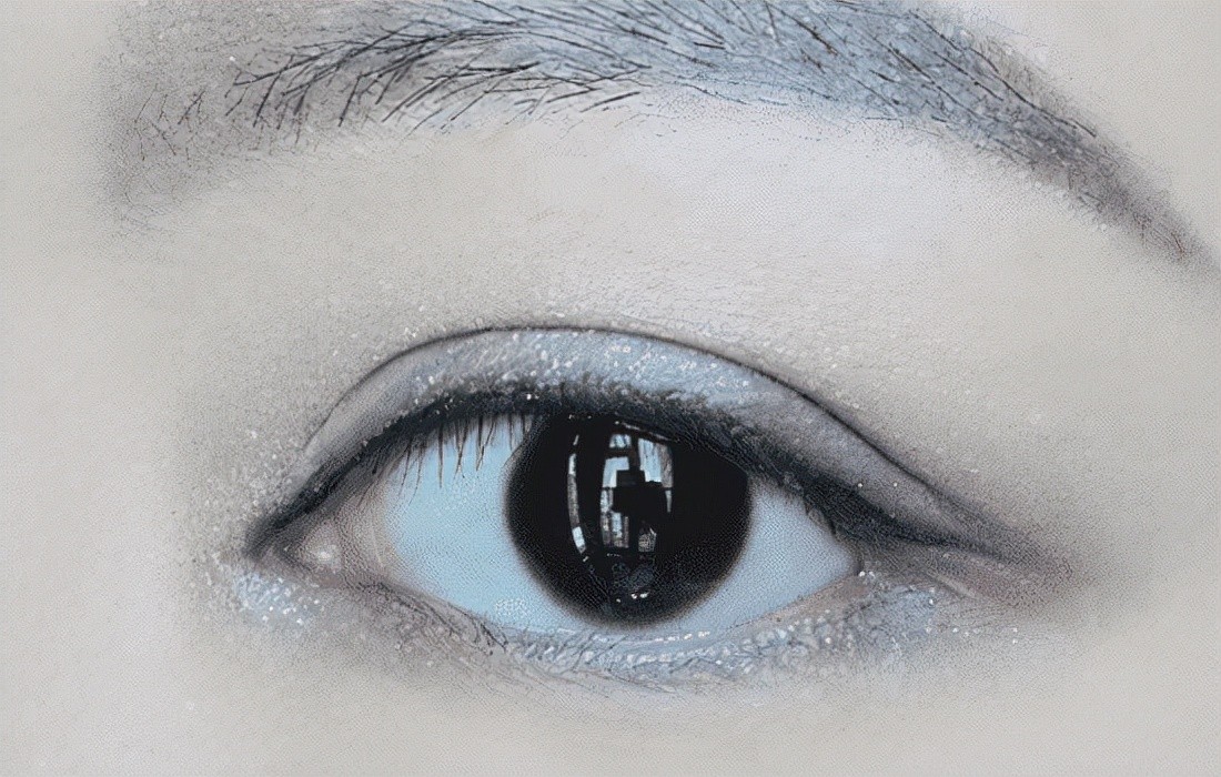 再用黑闪色在眼尾的三角区域轻轻晕染,加深眼窝,再用余粉加深眼头三角区域,涂抹在整条外眼线位置并稍加晕染。