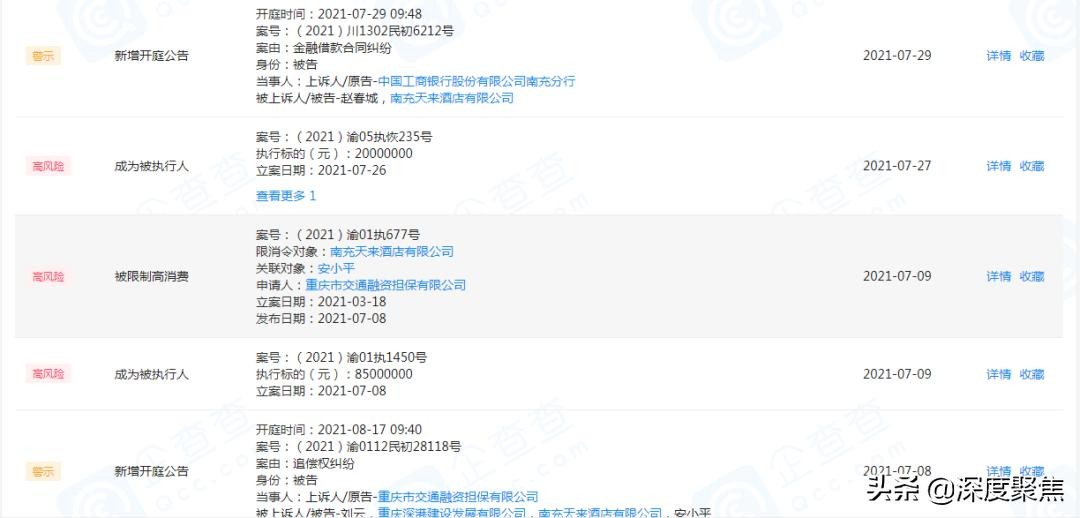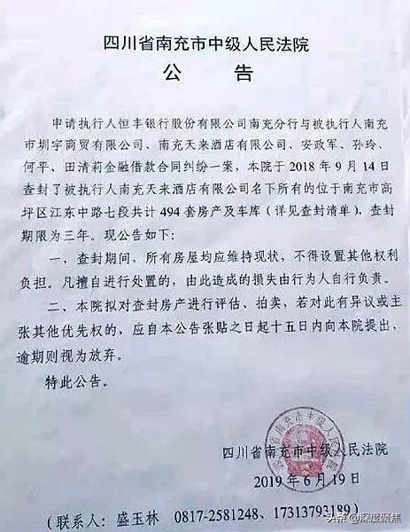 2019年6月,南充市中院曾因金融借款纠纷案,查封了南充天来酒店有限公司名下494套房产及车库。如果看到企查查上显示如此多的债务官司,那么这则公告只是天来众多债务纠纷的冰山一角。