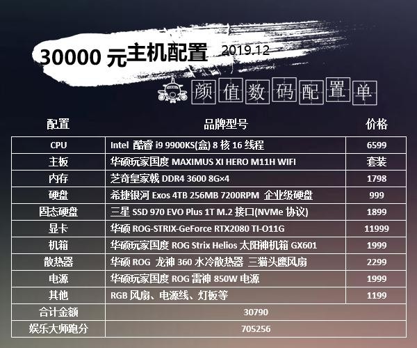 这套配置是标准的3W元ROG全家桶套餐。i9-9900系列的处理器(K/KF/KS差距不算大,根据预算选择)+M11H主板+2080Ti+龙神散热器+雷神电源+太阳神机箱,加上灯光特效,绝对高端拉风上档次。