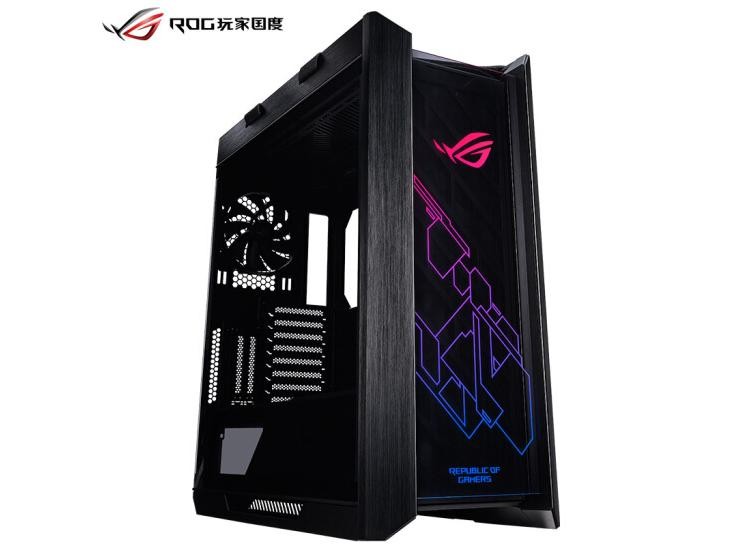 机箱是华硕ROG专属太阳神机箱,采用金属拉丝精钢和钢化玻璃组成,前面板有ROG的LOGO,并且可埋设可编程RGB灯带,灯光可接主板的ARGB接口,由主板来控制整机的灯光效果。非常的时尚炫酷。