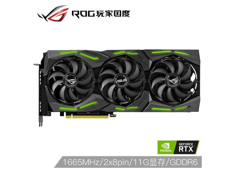 显卡是RTX2080Ti-O11G这款,12nm制程,拥有4352个流处理器,核心频率1350-1650MHz,GDDR6显存11G位宽352bit频率14000MHz,采用ROG经典散热设计,三风扇+散热鳍片。支持灯效,接口丰富。