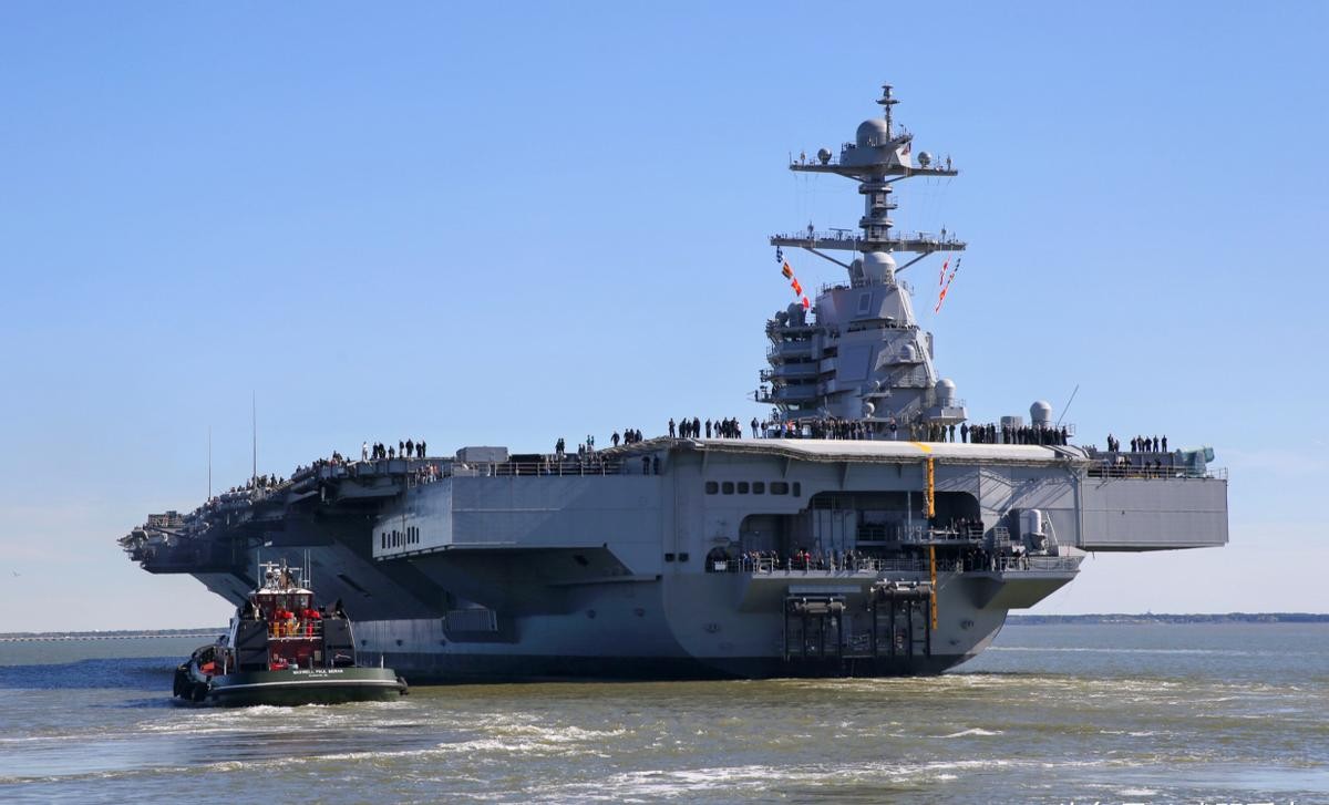 福特级航母可以搭载75架各种类型的舰载机,其中,有三十五架会被放在大型机库里,再由三个升降机将飞机送到长达1100尺长的航母飞行甲板上。