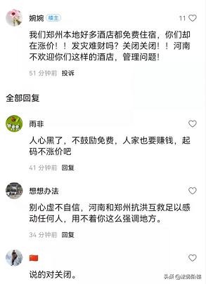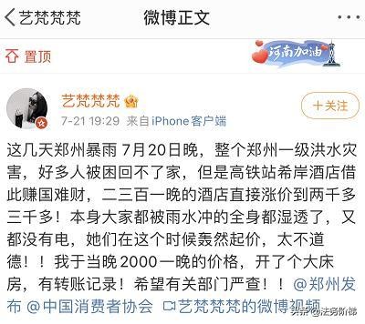 然而,7月21日,河南郑州,因暴雨滞留在郑州的旅客@艺梵梵梵 称,20日晚高铁站希岸酒店涨价到近三千元一晚。