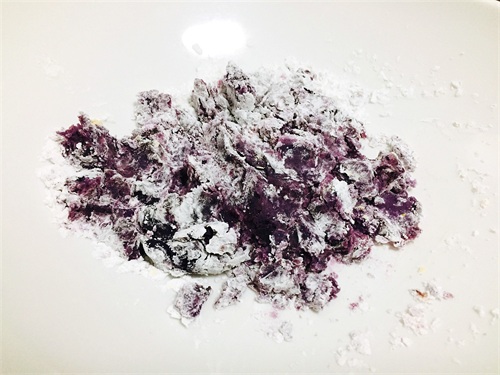 3.将三种食材分别放入盘中,紫薯比较干,用勺子按压碎,撒上木薯粉,揉成面团状。紫薯做成的芋圆比较容易干裂,这时候可以加一点水。