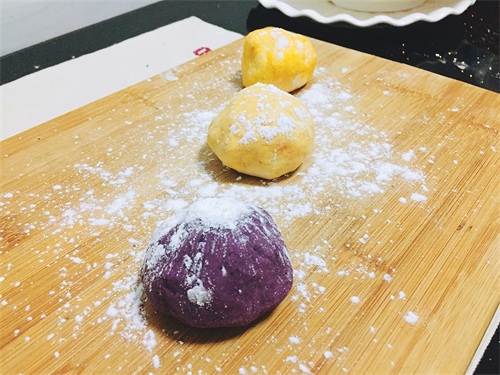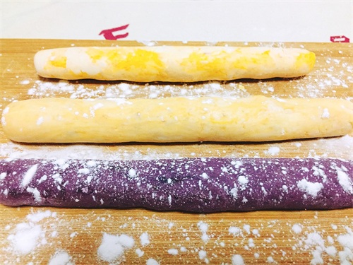 5.紫薯,地瓜,南瓜分别混合木薯粉,揉成面团后,再揉搓成长条状,注意在揉的时候,面板上撒一些木薯粉,避免粘住。