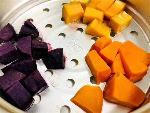 1.将紫薯、南瓜、地瓜分别清洗干净,去皮切块,上蒸锅隔水蒸熟。