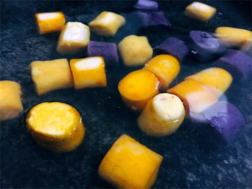 3.芋圆下锅的时候,水会变成青蓝色,不用担心,这是正常现象,是紫薯导致出现的颜色,紫薯中含有大量花青素,遇到酸碱不同的情况,就会变不同的颜色。
