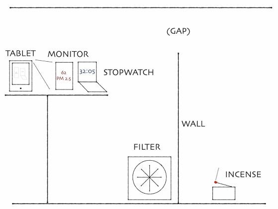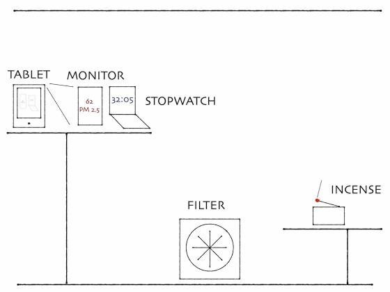 dynomight先生的实验环境如下。将空气监视器和秒表放置在体积为8立方米的小房间里,在用平板电脑拍摄情况的同时,燃烧香产生烟雾并操作空气净化器。此外,为了防止空气净化器的风影响烟量,在空气净化器和香之间夹了一堵墙,以防止风吹到它。