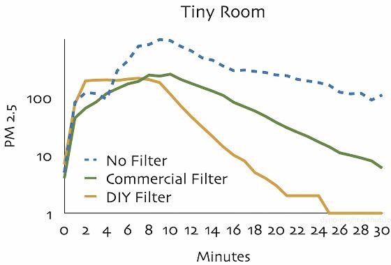 这是显示净化能力的对数-对数图。空气中的PM2.5浓度低于美国环境保护署推荐的“12微克/立方米”,在使用DIY空气净化器开始实验后需要约15分钟,使用市售空气净化器需要约25分钟。