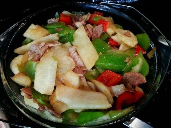 1、猪瘦肉切片,加入生抽、盐、料酒腌制15分钟,白地瓜剥皮切片,大葱切段,青椒切片;