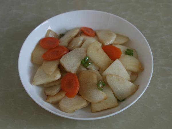 2、起油锅,放入姜蒜爆香,加入大葱和辣椒翻炒一后下白地瓜继续翻炒;