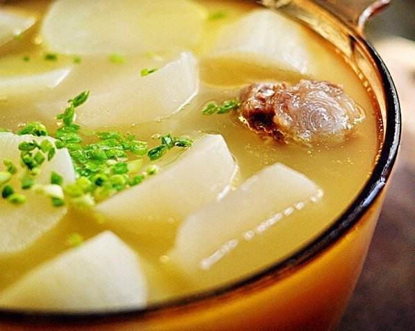 【用料:】猪骨,胡萝卜,地瓜,盐适量,味精适量,胡椒适量,葱花。