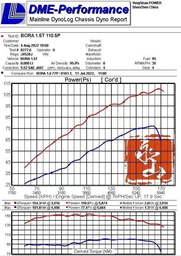在升级前我们有给这台宝来测试了它原厂的轮上马力,这条蓝色的线就是他原厂马力和扭矩,分别是77.4Ps/101.8Nm,然后升级完涡轮以后,轮上马力达到了110.5Ps/154.3Nm,相比原厂提升了40%马力,扭矩提升50%