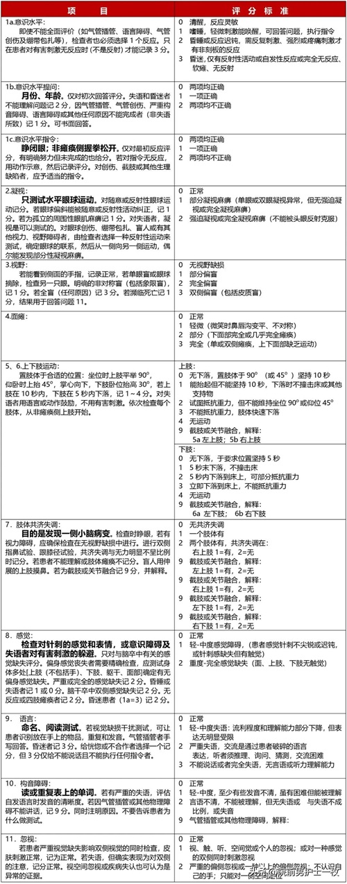 NIHSS(National Institutes of Health Stroke Scale)量表是一种标准化的神经科检查工具,用于评估脑卒中患者的神经功能缺损情况。该量表包含15项检查,总分为各项得分的总和,分数越低表示患者的状态越好。