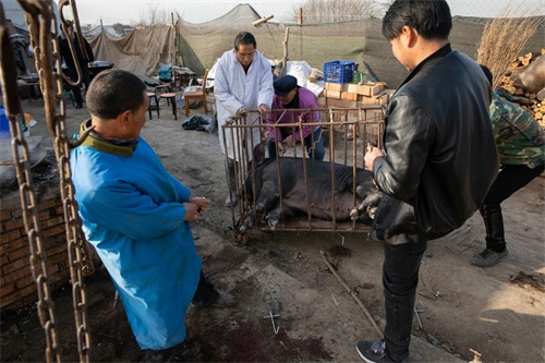 、围控:几个人围追堵截,把猪控制在铁笼内。