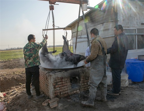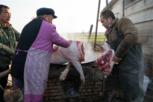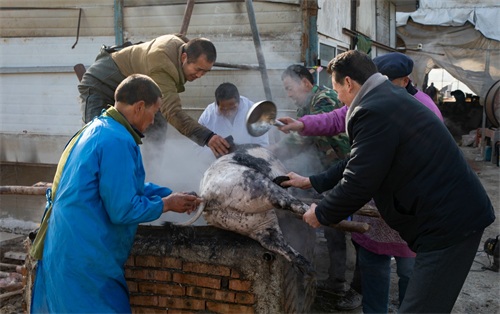 、汤猪:把猪放入烧好的开水锅里,均匀搅拌,以便拔毛。