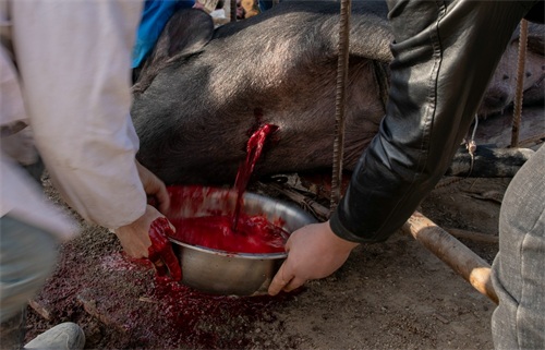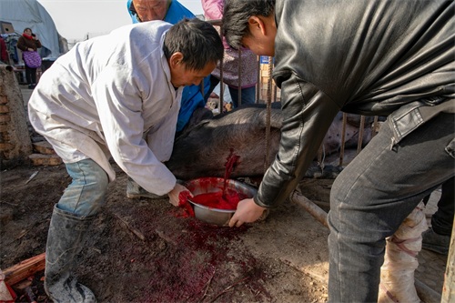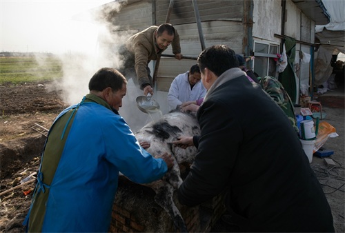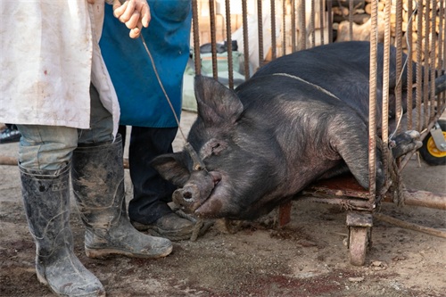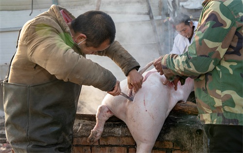 、戳猪:屠夫用杀猪刀捅入颈项,割断大动脉,血如泉涌......