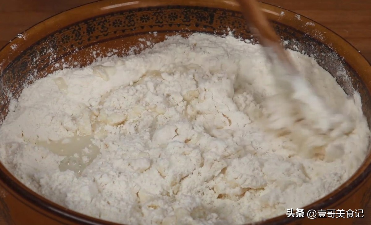 1. 先取出家里大和面盆,在里面加入200克面粉,然后再放进去食盐2克,用筷子将食盐给搅散开。接着,取出一些凉水,一边倒进面粉中间,一边用筷子进行搅拌,直到将碗中大部分面粉搅拌成絮状。