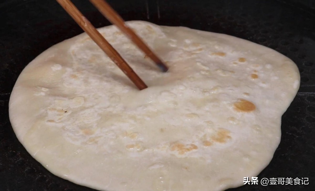8.用筷子将鼓起来的面皮上戳一个洞,注意了,只把上面一层皮给戳破,并且用筷子将破的地方给撑开,把准备好的鸡蛋液给倒进饼皮中间,然后,让它再烙一会儿。等饼里的鸡蛋定型了,用铲子将饼子翻个面继续烙。等两面都烙熟了,就可以关火取出来了。用这个方法把所有的饼都烙好。