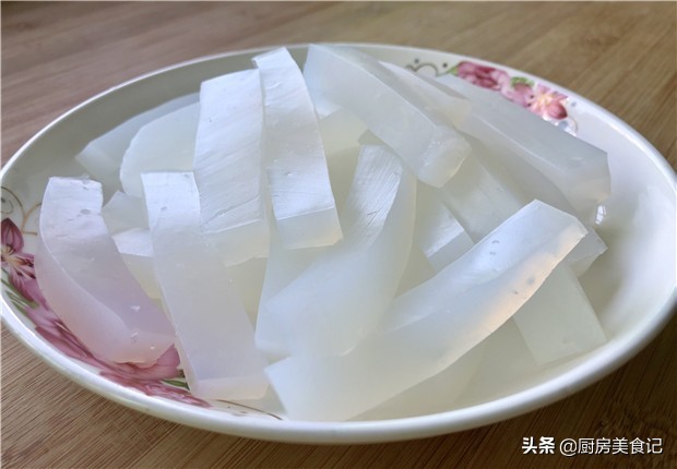 (6)、等凉粉放凉定型以后,把凉粉从碗中倒出,并用刀将凉粉切成片状,再切成细细的条状。最后把准备好的料汁,全部倒入凉粉条当中,搅拌均匀就可以进行食用了,在烈日炎炎的夏季,这道凉粉的美食制作,一定会让你很爱吃的。