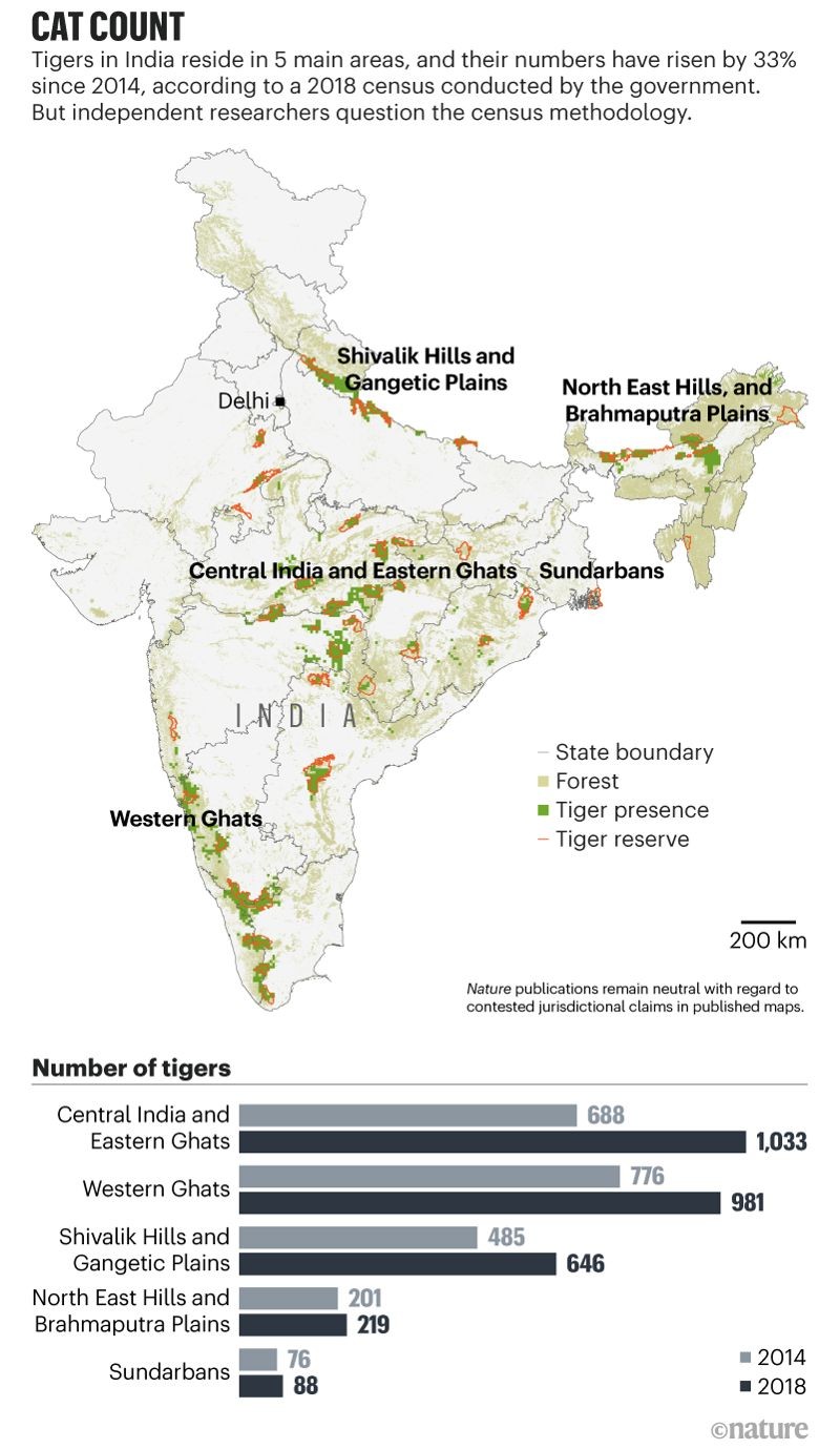 科学家们对老虎普查的方法提出质疑 来源:Y. V, Jhala, Q. Qureshi, & A. K. Nayak, (eds) Status of Tigers in India 2018 (National Tiger Conservation Authority & Wildlife Institute of India; 2019); M. Natesh et al. Sci. Rep. 7, 9614 (2017).