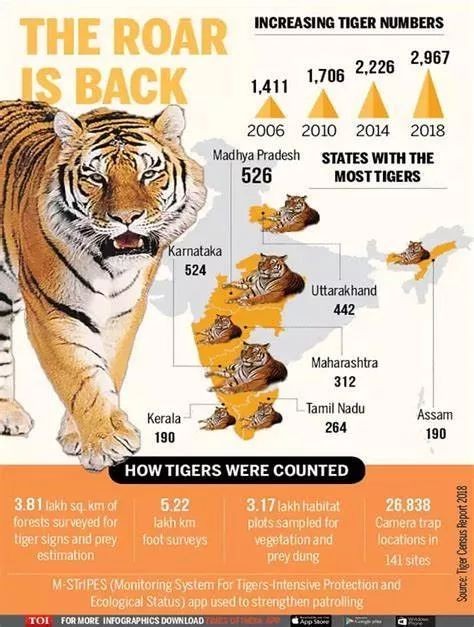 WII的老虎项目领导人以及调查负责人Yadvendradev Jhala说,除非你清楚保护区内具体有什么,有多少,否则很难开展具有针对性的保护工作。最新的一次调查结果显示老虎的数量在回升,总理莫迪也庆祝了自2014起33%的增长量。