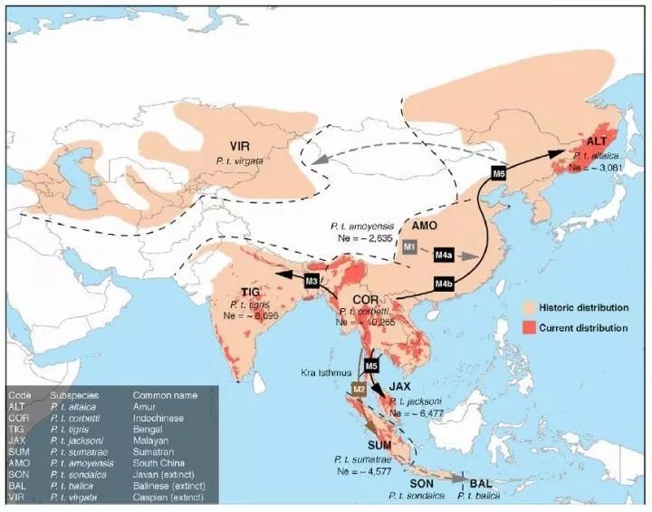 这张地图显示了现代老虎的分布路线和活动范围假设© Liu et al. / Current Biology