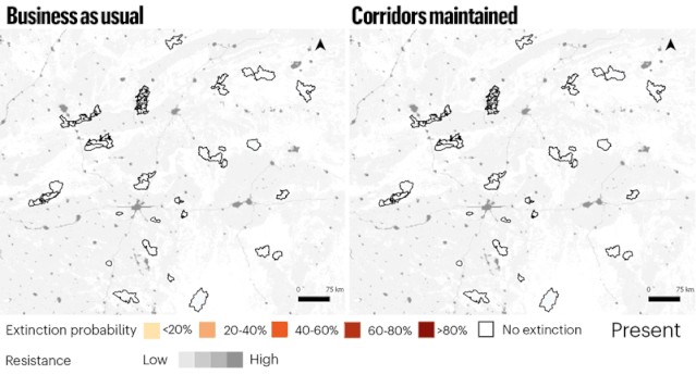 一项研究评估了印度中部保护区老虎灭绝的可能性。如果森林廊道在保护区之间保持完好(右图),它们有助于减少老虎的灭绝,而在正常情况下,廊道没有得到维护,城市发展、道路和交通使老虎的移动受到阻碍。来源:P. Thatte et al./Biol. Conserv