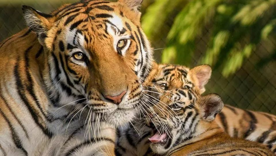 一只在印多尔动物园里与老虎宝宝在一起休息的雌性老虎,2018 ©Hindustan Times