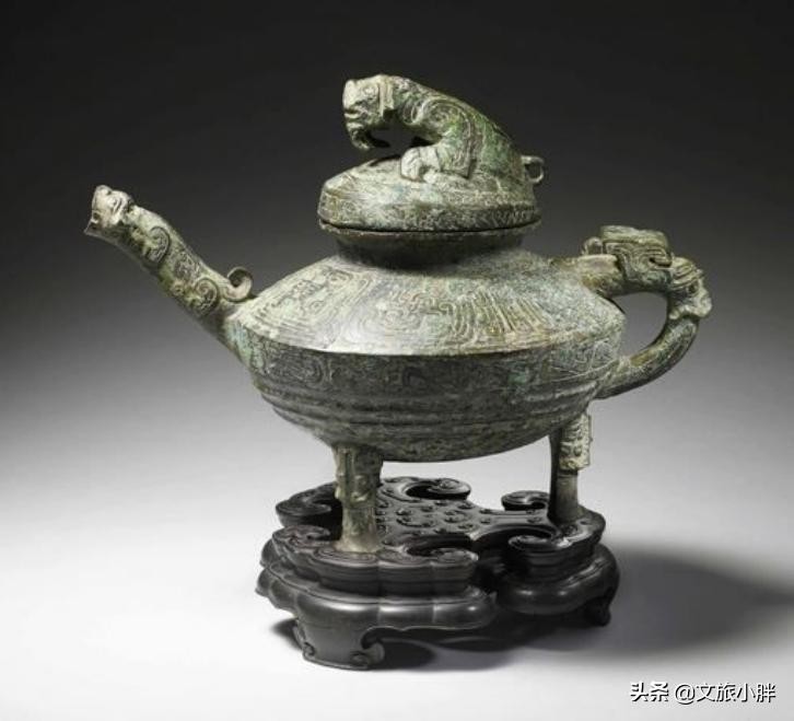 尊是一种盛酒的容器,盛行于商代和西周时期,到春秋、战国的时候就渐渐消失了,按照东汉许慎《说文解字》中的解释,尊是祭祀时接待宾客所用的礼器,用于表达主人的敬意。所以“尊”又有敬重、高贵的意思。“尊重”、“尊敬”等也就变成了对人的一种敬重之词。这件商代晚期铜尊,大口外侈,中部圆鼓,下接喇叭形圈足,肩部和腹部装饰有兽面纹等花纹,肩部等距离排列三个浮雕的牛首。这件铜尊据称20世纪20年代出土于河南某地,不久即被销往欧洲,2000年保利艺术博物馆将其抢救回国,现藏于北京保利艺术博物馆。此尊形体较大,造型十分规整,展现出很高的铸造工艺水平,一直被欧洲的青铜器学者视作公元前14世纪前后中国青铜艺术的代表作之一。