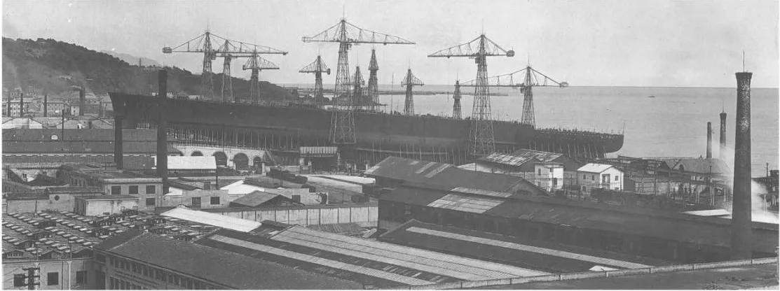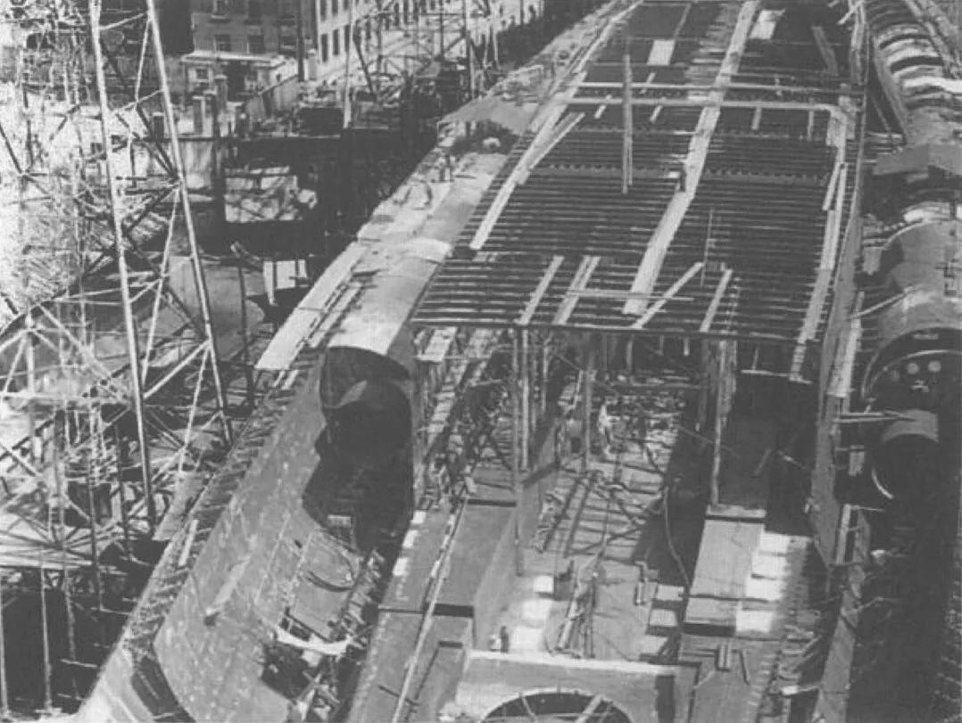 建造中的利托里奥号战列舰,其舰体两侧的普列塞系统清晰可见