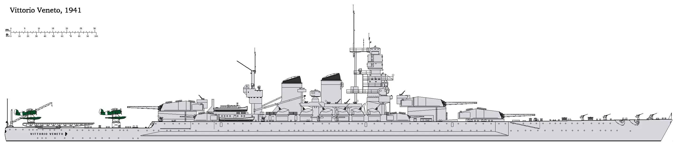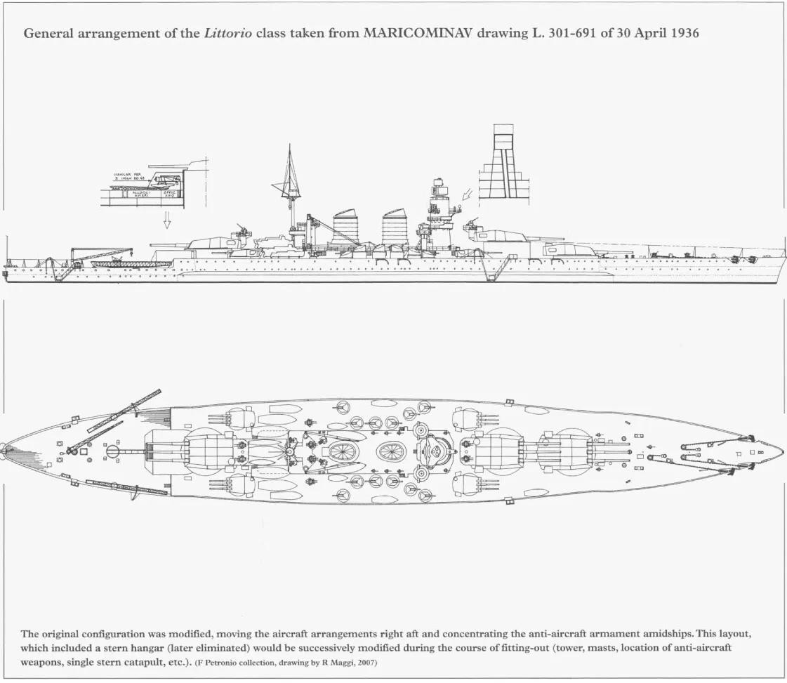 此时的维内托级战列舰全长237.7米,水线长为232.4米,宽32.9米,水线宽32.4米,满载吃水10.5米,标准吃水9.8米。装备有3座三联装M1934安萨尔多50倍径15英寸主炮,4座三联装55倍径6英寸副炮,主机功率为130000马力,航速达30节。