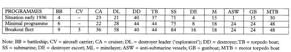 该方案设想:意大利海军到了1944年将会拥有由8艘战列舰(共236000吨),3艘航空母舰(共34000吨),7艘重巡洋舰(共70000吨),20艘轻巡洋舰(共120600吨),135艘鱼雷艇(共168152吨)及115艘潜艇(共93900吨)组成的舰队。