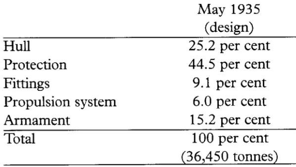 修改设计后的维内托级战列舰吨位占比,其中36450吨是空载排水量