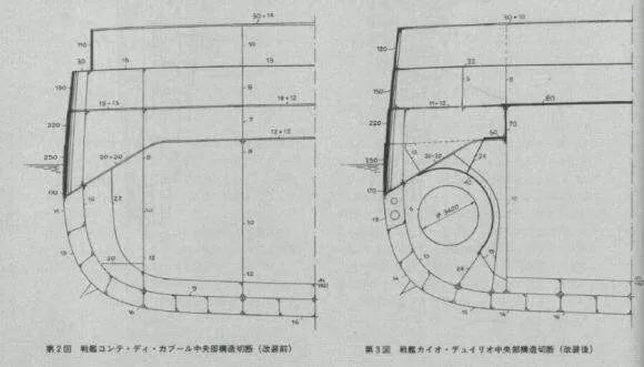 改造前(左)及改造后(右)的安德烈·多利亚级战列舰装甲结构示意图