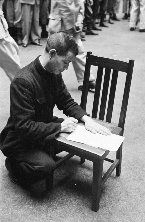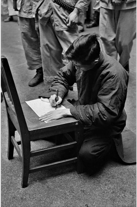 3、穿着中山装的中年人,他就是首犯陈惕庐,正蹲着趴在凳子上写遗书。那篇报道载明了他的身份:陈惕庐,年五十六岁,江苏淮阴人,南京文风书局经理,中国农工通讯社长,曾历任贵州省党部主任委员、山东省党部执委、中央组织部战地党政处处长、浙江省政府委员、苏浙两省训练团教育长,从上年十一月间,与高宗禹、许闻天、刘不同、谌小岑等发起组织《孙文主义革命同盟》,任该伪总盟常委兼组织部长,复兼上海支盟负责人,孙盟组织纲领即由其主稿,并曾参加李济深之伪《国民党革新委员会》,曾主使严一民策反警备总部高参陈祖敏(陈未为所动),委派张达生过江与共党联络,企图分化政府实力,策应共军过江,叛党祸国,污蔑蒋总统,已于其侦讯笔录及其自白书中供认不讳。