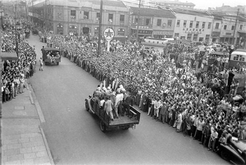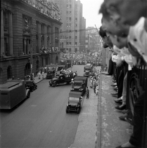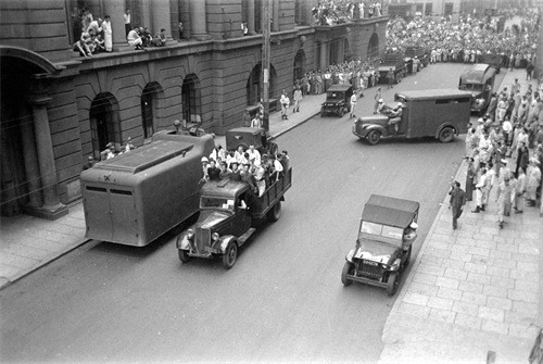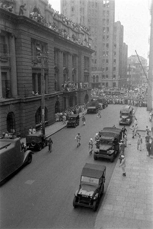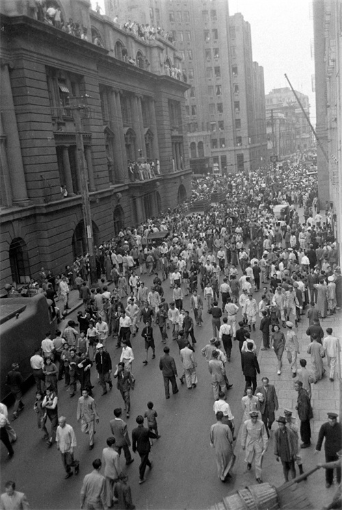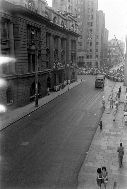 15、这张照片由美国记者哈里森·福尔曼拍摄,他当时就站在囚车上,对面是上海市中区的上海市银行,门前和门楼上站着很多人,除了楼下右侧几人面露沉重之色,其余人仿佛是在看戏一般。