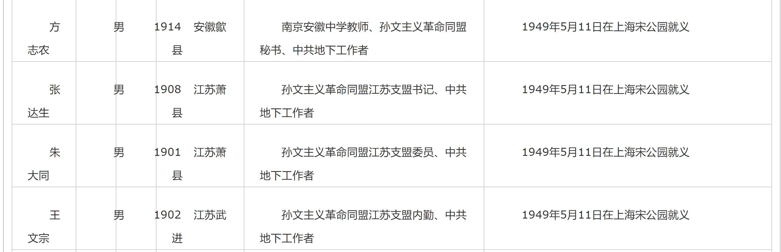 中华英烈网记载的档案:方志农烈士1914年出生于安徽歙县,原是南京安徽中学教员,因参加策反工作,一九四九年在南京被捕,同年五月十一日被杀害于上海宋公园。