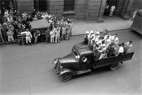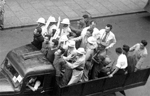 18、囚车驶近美国记者Jack Birns的镜头位置,他俯拍的这张照片极为清晰,车尾有两位外国人,其中一人就是美国记者哈里森·福尔曼。