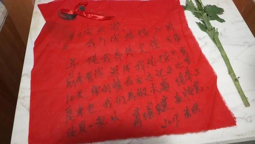葛璀瑾老人在去世前一年,知道自己身体每况愈下,时日无多,便将自己的发丝和一方红帕托人带到烈士陵园,红帕上她亲笔写着:王文宗夫君,我与你结婚70周年,现我身体欠佳,不能前来看你,虽你我结婚只有10天,你的情我永远记在心里,愿来世我们再做夫妻,现奉上头发一束以表情意,葛璀瑾2019清明。