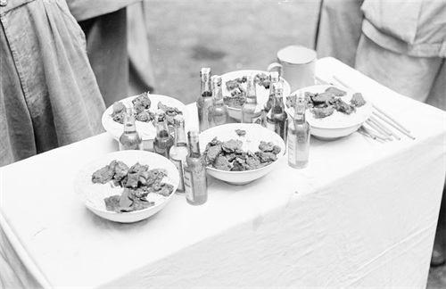 2、给即将押赴刑场的人们准备的阳春面,这是警察局旁的“小常州”面馆提供的五碗面,有着很多牛肉,旁边还有几瓶酒。