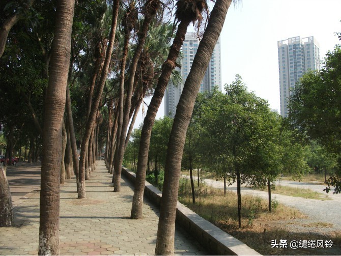 穿过竹仙公园的门牌坊,路边的树木栽种得很有特点,都是三棵树联成一排!
