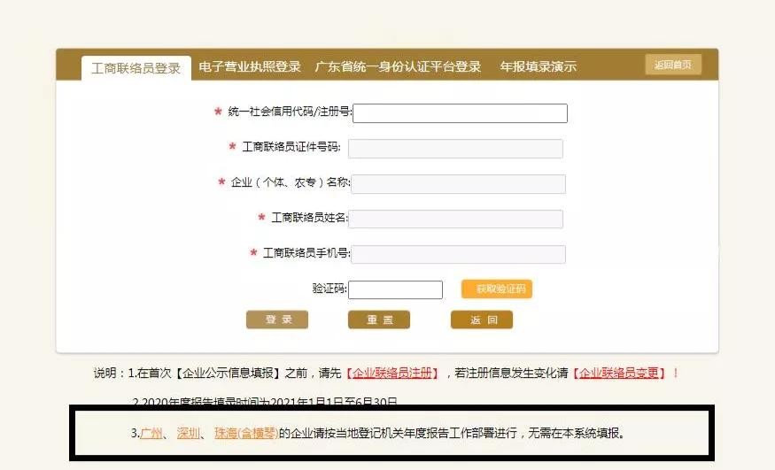 注意看当前界面下方的【说明】,个别地区需在当地工商局官方网站进行工商年报,以广州为例: